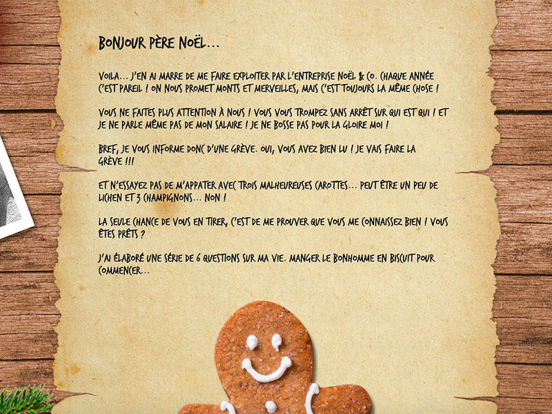 Comète acceptera d’annuler sa grève si Santa résoud une série de 6 questions/énigmes sur sa vie de renne.